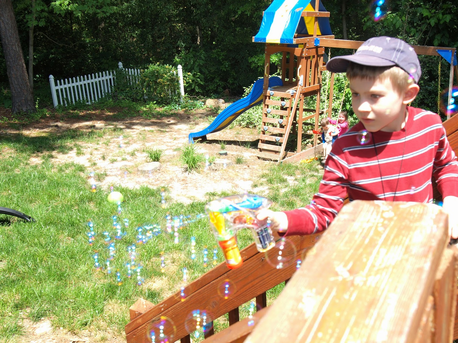 The weather has been beautiful lately!!! We've had lots of nice days to spend outside lately, which has been fun :). One afternoon we spent blowing bubbles with the bubble gun Gramma sent us (thank you so much Gramma! The hundreds of bubbles it makes at a time are gorgeous!!!!). Since Emmi's birthday the little ones have also enjoyed playing in the sandbox a couple times, since Daddy filled it for the special occasion :).
